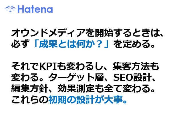 一方、成果のでないオウンドメディアは「情報の粒度を広くすることで自社のプロダクトと距離が離れてしまっている」ケースが多いと指摘します。「オウンドメディアを開始する時は、成果とは何かを定めることが重要。成果が定まっていないと、KPIやターゲット層、編集方針など全ての項目が変わる」と初期設計の重要性を語りました。