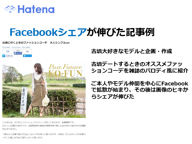 Facebook数が伸びた記事は、古墳大好きなモデルと企画・作成した記事です。古墳デートするときのおすすめファッションコーデを雑誌のパロディ風に紹介。記事に参加したモデルさんやモデル仲間を中心にFacebook拡散がはじまり、その後は画像をフックにシェアが伸びました。