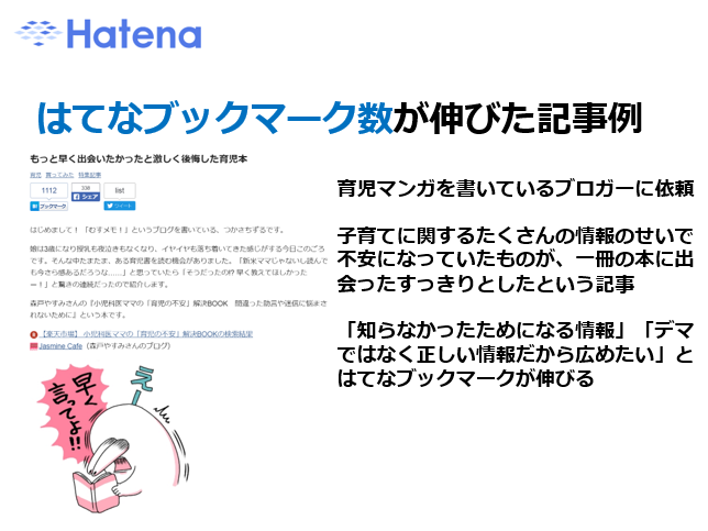 はてなブックマーク数が伸びた記事は、育児マンガを書いているブロガーさんに依頼した記事です。子育てに関する情報がたくさんあるせいで、不安になっていたものが一冊の本で出会ってすっきりしたという記事。「知らなかったためになる情報」「デマではなく正しい情報だから広めたい」と、はてなブックマークが伸びました。
