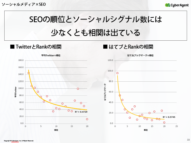またソーシャルメディアのなかでも、「SEO狙いのニーズが網羅された記事は、はてなブックマークとの相性が良い」と紹介しました。勝浦氏は、「因果の証明には至っていないが、ツイート数、はてなブックマーク数などのソーシャルシグナル数とSEO順位には相関性がでているものもある」と説明。ベースの集客経路としてSEOを据えて、ソーシャルメディア経路の流入をアドオンする形式が効果的だと説明しました。